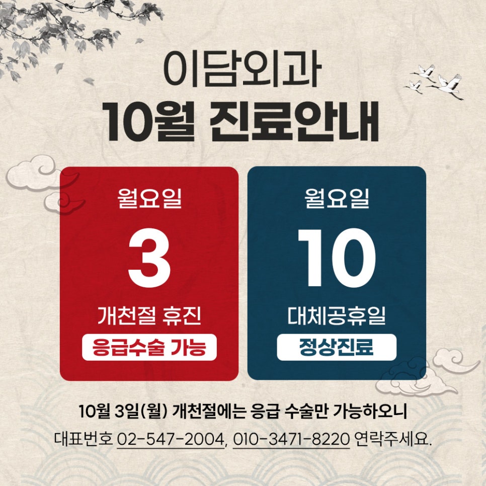 10월 이담외과 진료안내 10월 3일 (개천절, 응급수술) 10월 3일은 개천절이자 응급수술을 위한 진료일로 운영됩니다. 응급상황이 발생할 때에도 언제나 환자 여러분께