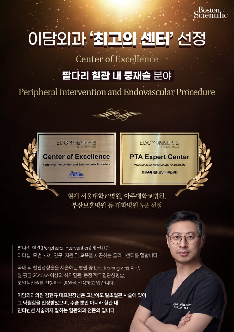 이담외과, 팔다리혈관 내 중재술 분야 ‘최고의센터’ 선정 이담외과가 팔다리혈관 내 중재술 분야에서 최고의 센터로 선정되었습니다. 최고의 의료진과 첨단 시설을 갖춘